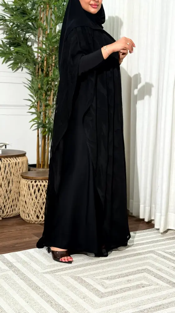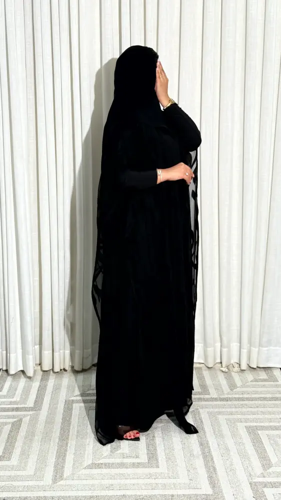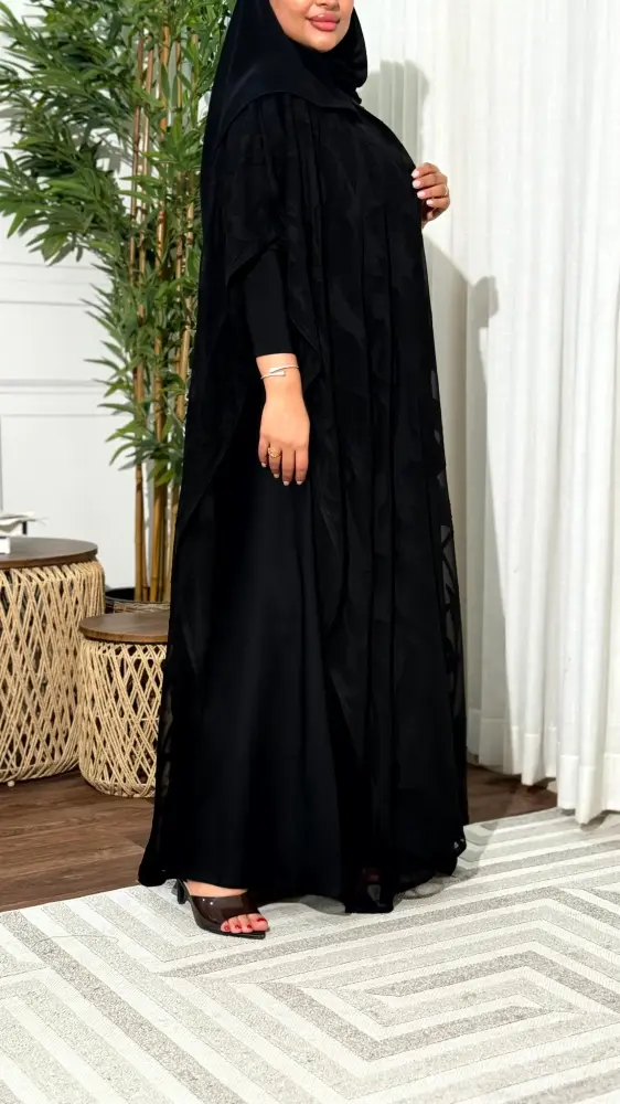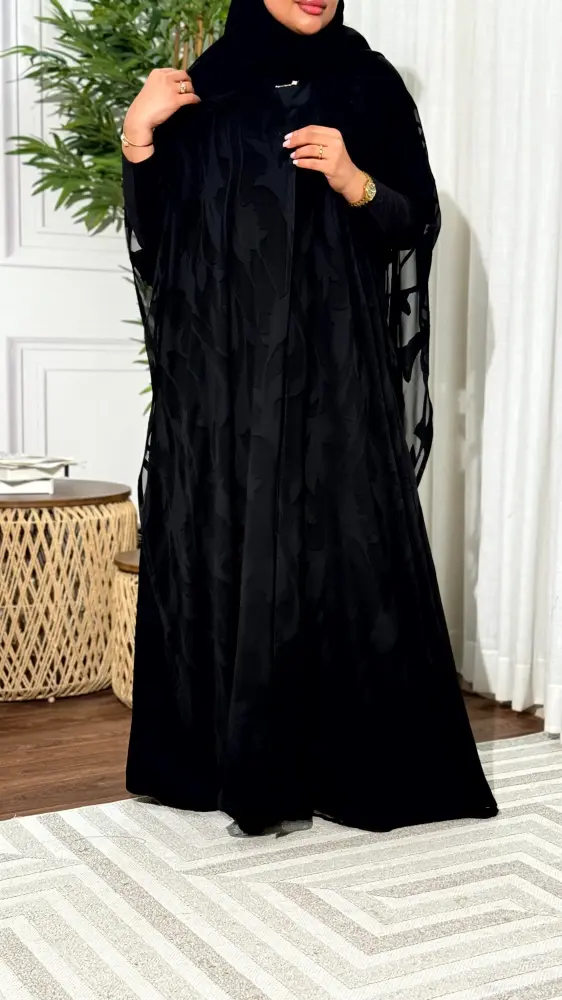نقشة التشجير على الشيفون تمنح العباية طابعًا فاخرًا ومميزًا يختلف عن العبايات السادة، مع الحفاظ على خفة القماش ونعومته التي تجعلها مريحة طوال اليوم.