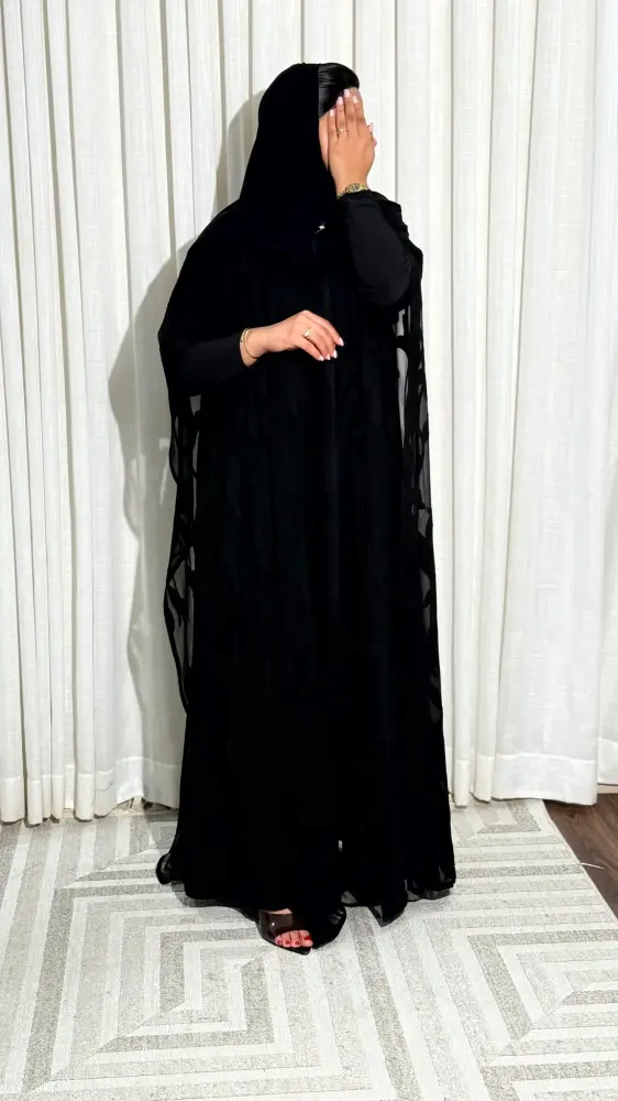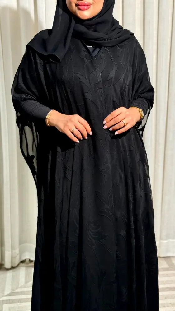 تُقدّم عباية MS772 لمسة مختلفة من خلال قماش الشيفون المشجر الذي يُضيف عمقًا وتفصيلًا بصريًا جميلًا، مع الحفاظ على أناقة قصة نص كلوش الكلاسيكية.