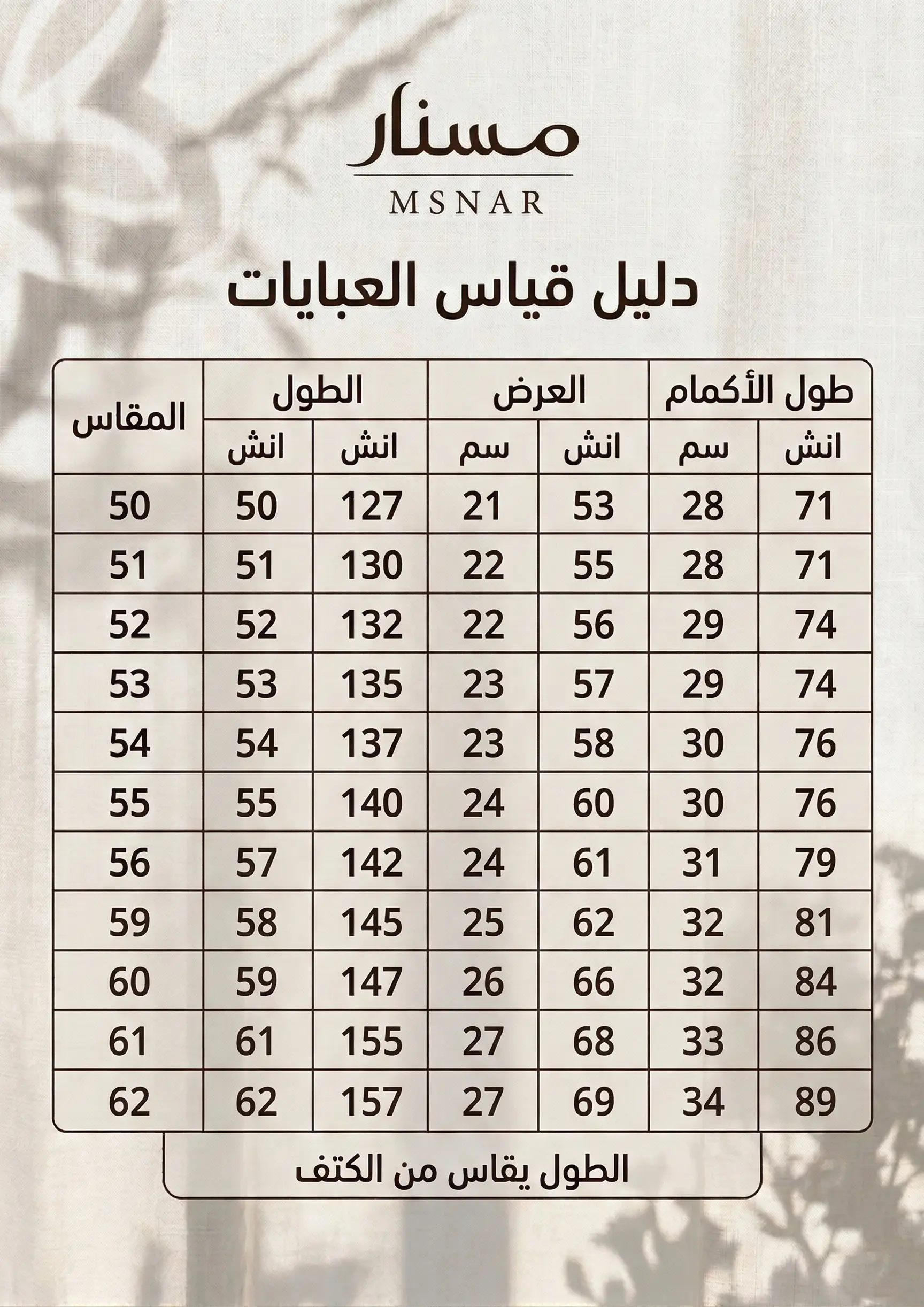 2. مقاسات العباية حسب الطول (من 50 إلى 62)